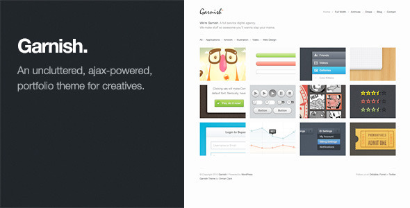 Garnish is a clean-cut, straight to the point, simple to use portfolio theme. The uncluttered, one-page, ajax-powered portfolio is perfect for placing your most important work directly in front of your potential clients.